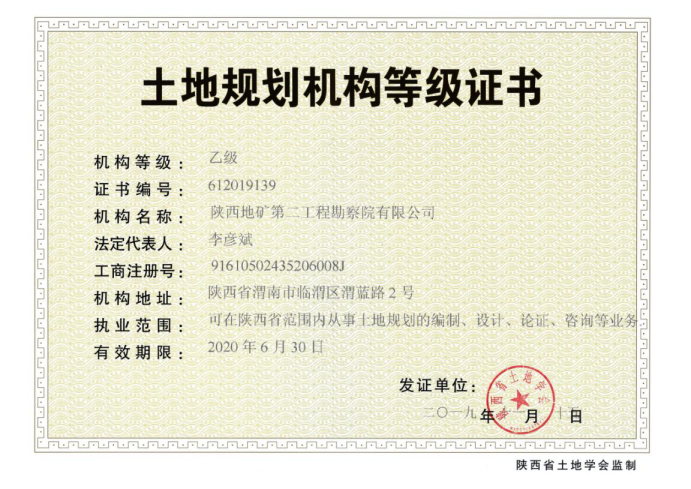 根據(jù)《陜西省土地規(guī)劃?rùn)C(jī)構(gòu)管理實(shí)施辦法》的規(guī)定和要求,在公司相關(guān)部門(mén)的支持下,由勘院綜合部具體負(fù)責(zé)申報(bào),我公司于2019年11月15日成功獲得由陜西土地學(xué)會(huì)評(píng)審頒發(fā)的“土地規(guī)劃?rùn)C(jī)構(gòu)”乙級(jí)資質(zhì)證書(shū)。