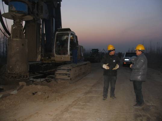 19日一大早,由韋永智隊長帶隊,副隊長安林、張巍、黨群工作部與基礎工程處經(jīng)理南峰等一行驅(qū)車趕往目的地。一路上經(jīng)太原、過石家莊,途經(jīng)大小市、縣十余個,也無一時停歇。下午6時左右,終于到達了由隊基礎工程處承擔的“天津—保定高速鐵路線米寧莊特大橋項目”樁基施工地。韋隊長向所有職工表示親切慰問,并向該項目2010年度四位優(yōu)秀職工現(xiàn)場頒發(fā)了獎金和證書,安林、張巍副隊長了解了項目生產(chǎn)、生活情況。直到天色已晚,幾位領導在視察完XZ-20旋挖機現(xiàn)場施工后,才離開了工地。