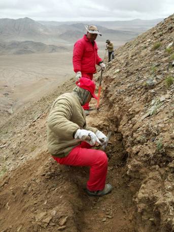七月的高原,熾熱的太陽烘烤著大地,強(qiáng)烈的紫外線穿透衣服,像是要把人的皮膚撕下一樣,使人感到灼痛。我隊地勘二所新疆若羌縣庫木布拉克、阿其布拉克銅金普查項目的職工正拿著鐵鍬揮汗如雨,標(biāo)準(zhǔn)的、長長的探槽在他們腳下延伸,黑紅的臉頰皮膚皸裂。