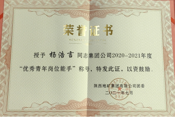 2020年9月-11月先后獲得了全國地質(zhì)勘查行業(yè)首屆地質(zhì)調(diào)查員(地質(zhì)災(zāi)害方向)職業(yè)技能競賽陜西省初賽“第一名”及全國決賽“優(yōu)秀地質(zhì)調(diào)查員”稱號,2020年12月獲得陜西地礦集團有限公司“優(yōu)秀員工”稱號,2021年7月被集團公司團委評為2020-2021年度“優(yōu)秀青年崗位能手”稱號。(黃華偉)