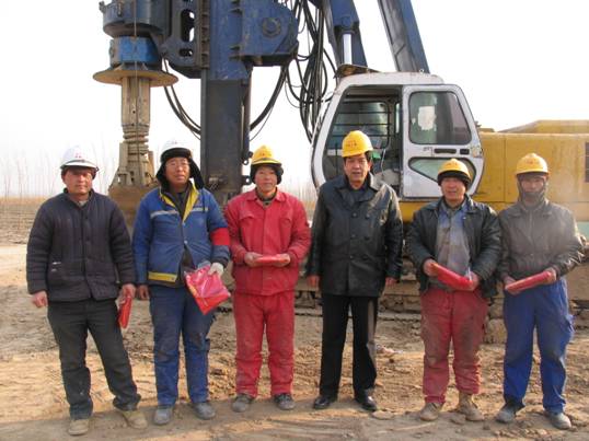 19日一大早,由韋永智隊長帶隊,副隊長安林、張巍、黨群工作部與基礎工程處經(jīng)理南峰等一行驅(qū)車趕往目的地。一路上經(jīng)太原、過石家莊,途經(jīng)大小市、縣十余個,也無一時停歇。下午6時左右,終于到達了由隊基礎工程處承擔的“天津—保定高速鐵路線米寧莊特大橋項目”樁基施工地。韋隊長向所有職工表示親切慰問,并向該項目2010年度四位優(yōu)秀職工現(xiàn)場頒發(fā)了獎金和證書,安林、張巍副隊長了解了項目生產(chǎn)、生活情況。直到天色已晚,幾位領導在視察完XZ-20旋挖機現(xiàn)場施工后,才離開了工地。