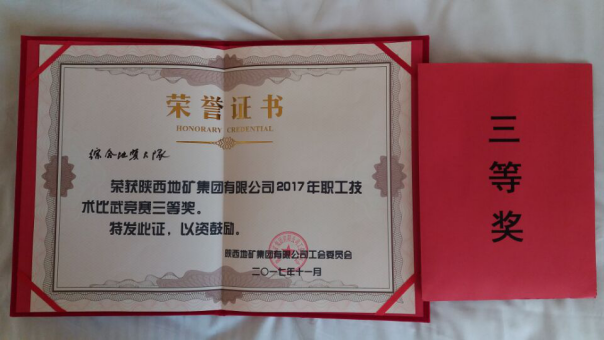 11月24日,我隊(duì)在陜西地礦集團(tuán)有限公司組織的“2017年職工技術(shù)比武”活動(dòng)中榮獲三等獎(jiǎng)。