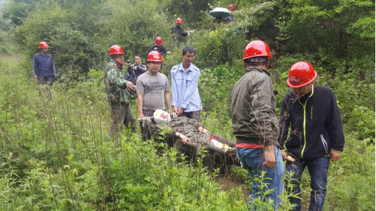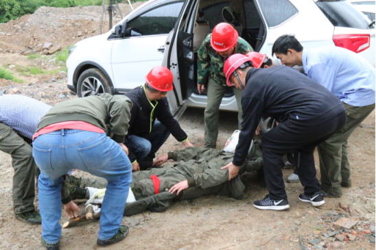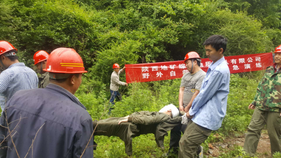 中午12點25分演練活動正式開始,野外地質調查項目組一行3人上山采樣,下山途中一人腳下踩空滾下山坡,被樹木擋住,造成腿骨骨折、頭部擦傷、多處軟組織挫傷。事故發(fā)生后同組人員一邊利用現場急救物品向傷者施救,一邊向項目組組長匯報事發(fā)情況,請求支援。項目組長將情況馬上匯報給公司安全管理與保衛(wèi)部,同時立即組織人員帶著醫(yī)藥箱、斧頭、繩子等應急物品開車迅速趕往事發(fā)現場。救援人員到達現場后按照劇情分工,迅速進入角色,各負其責,有人現場砍樹,有人制作簡易擔架、有人熟練進行骨折處理和包扎,很快將傷員抬到山下自備車中。